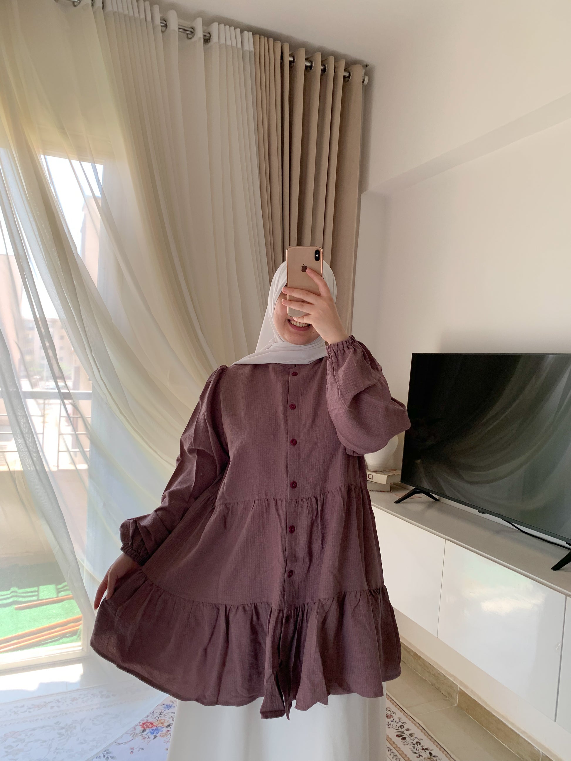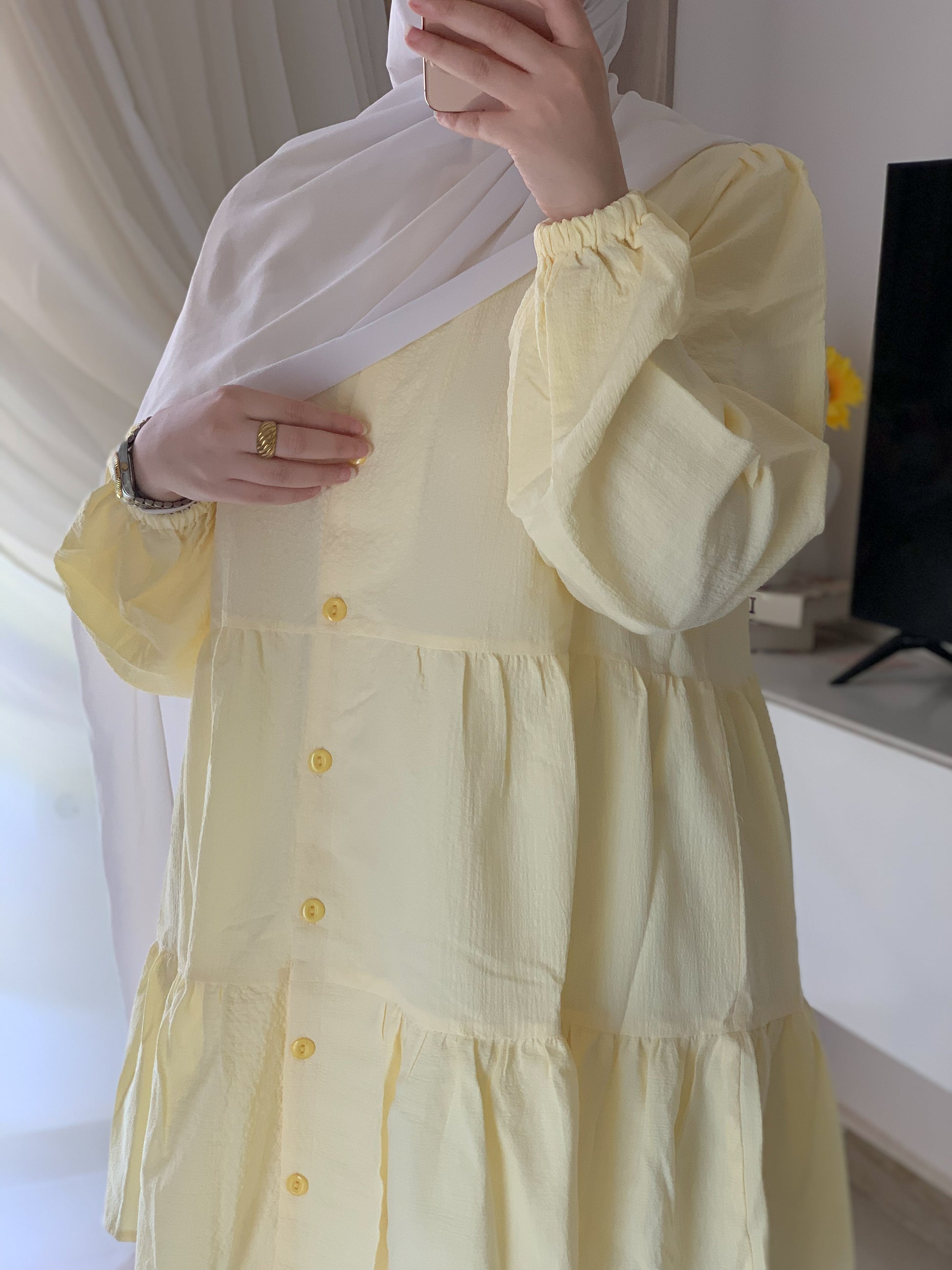 تفاصيل الأزرار الأمامية تضيف لمسة كلاسيكية ناعمة، بينما القصّة الواسعة تمنح حرية حركة وأناقة انسيابية.
