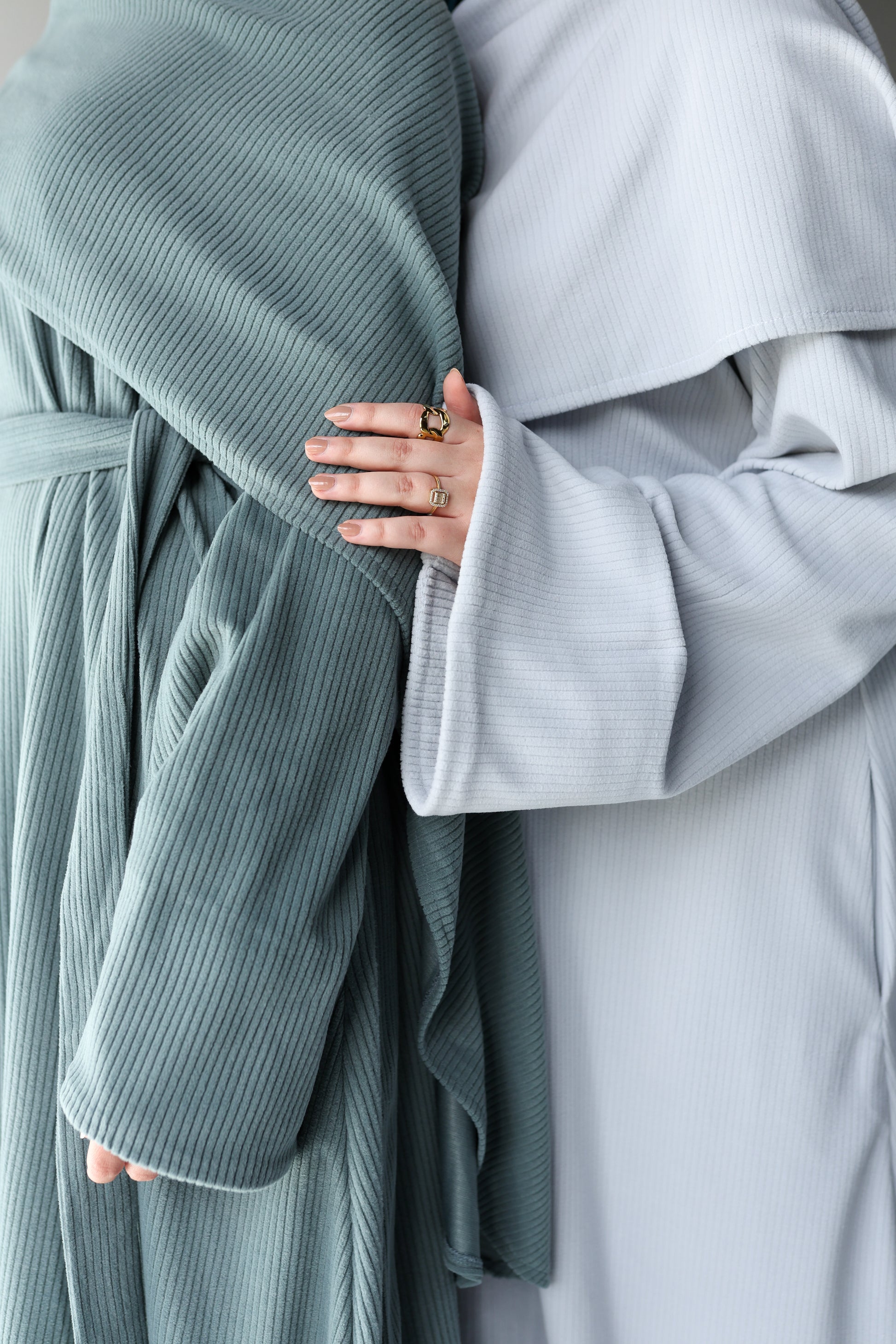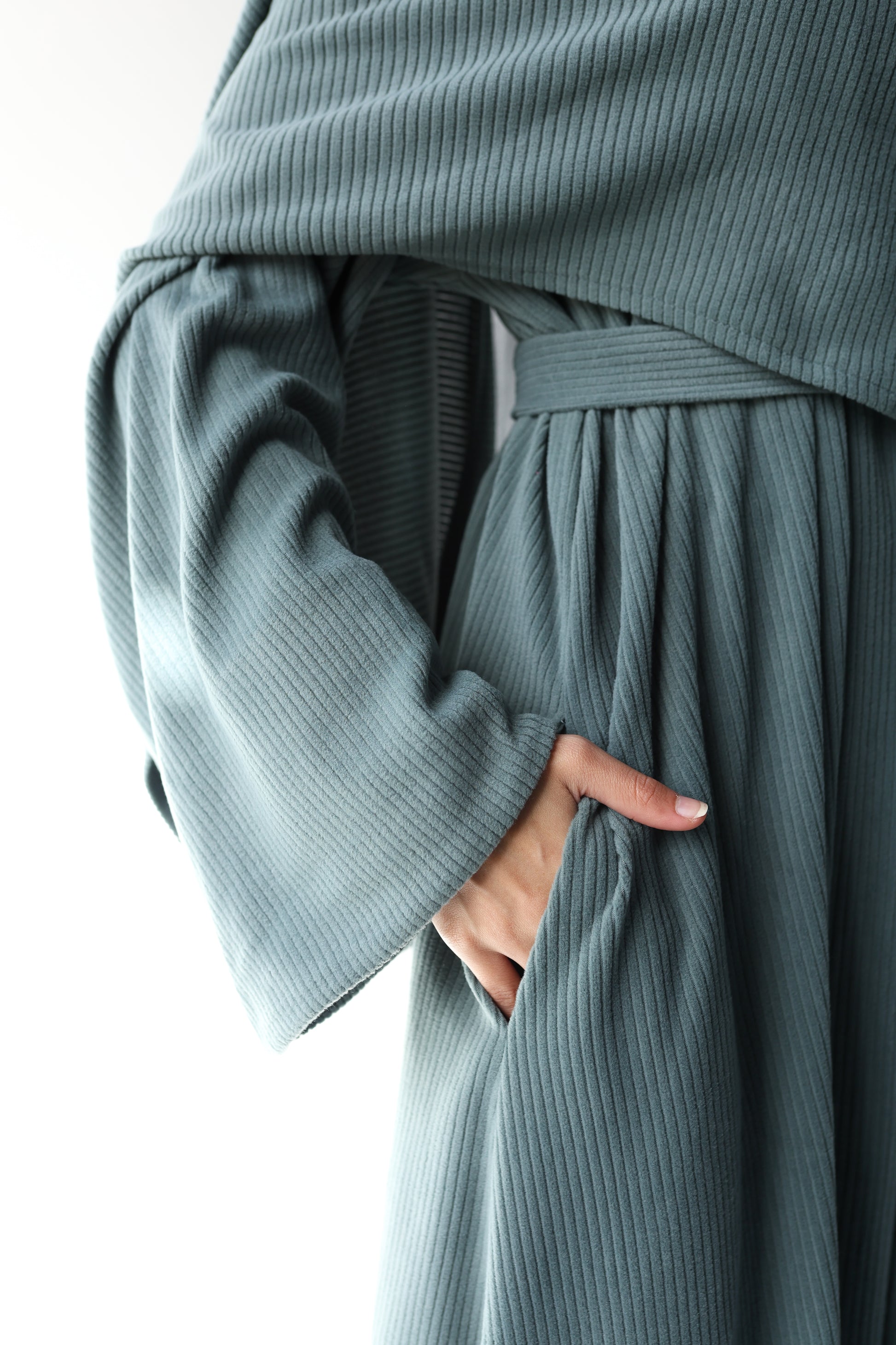 بخامة القطيفة المُقلمة ولمستها الناعمة، يأتي فستان يُسر بتصميم واسع وانسيابي يمنح إطلالة راقية وعمليّة في الوقت نفسه.